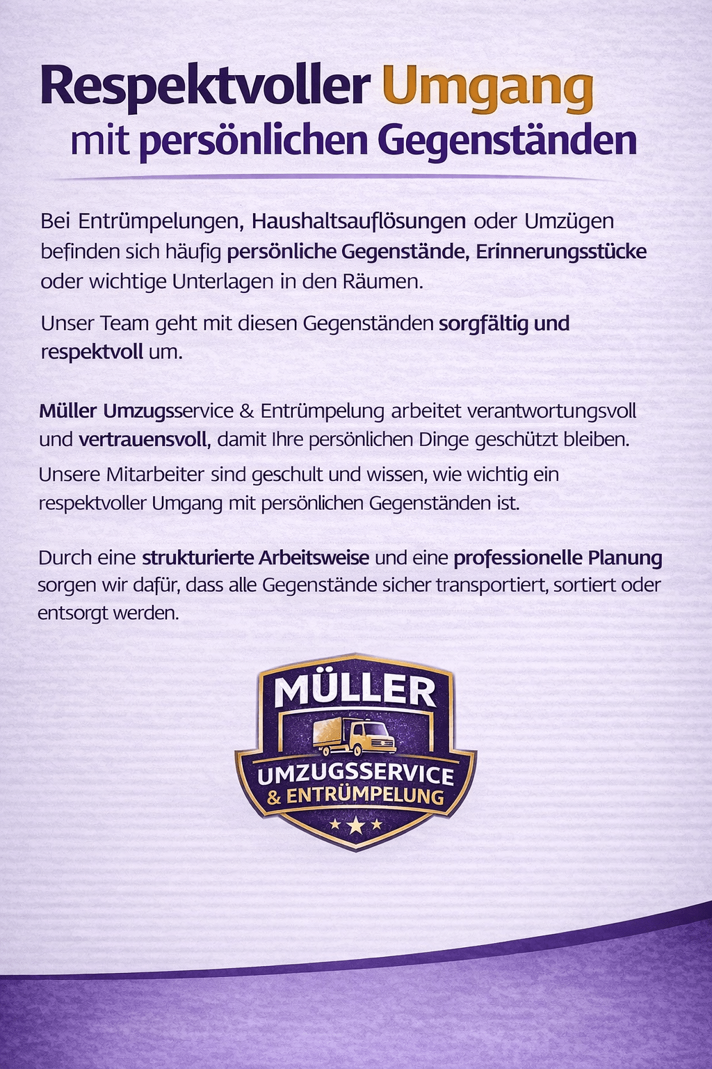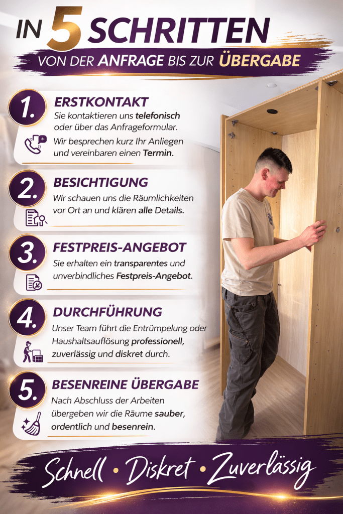 Durch transparente Preise, klare Terminabsprachen und eine strukturierte Planung sorgen wir dafür, dass Ihr Auftrag zuverlässig durchgeführt wird. Unser Team arbeitet organisiert und effizient, damit Umzüge, Entrümpelungen und Haushaltsauflösungen reibungslos ablaufen.