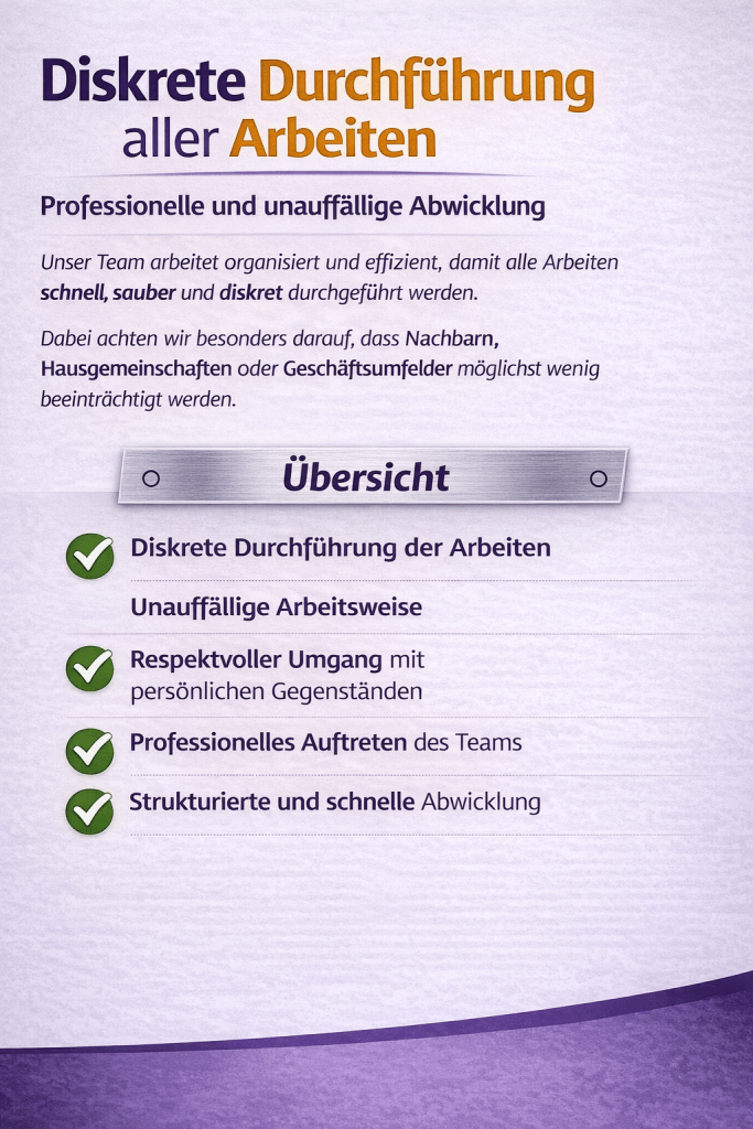 Eine diskrete Abwicklung beginnt bereits mit einer sorgfältigen Planung. Vor Beginn der Arbeiten erhalten Sie eine kostenlose Besichtigung sowie ein unverbindliches Angebot. So wissen Sie genau, welche Leistungen durchgeführt werden und wie der Ablauf organisiert ist.